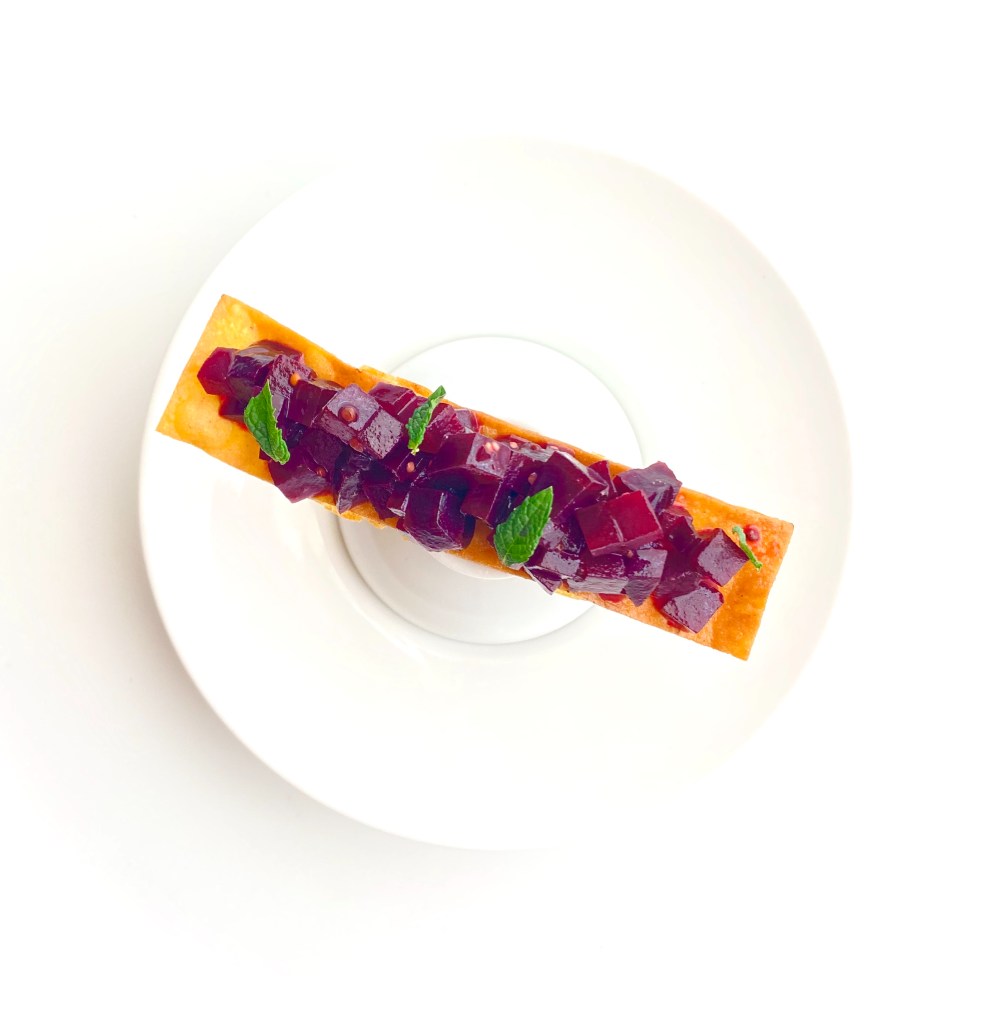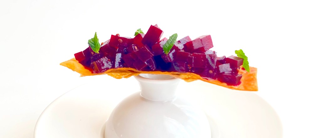 Para finalizar pondremos sobre nuestro crujiente de maíz el tartar de remolacha de manera estética. Para decorar podemos usar pequeñas hojas de hierbabuena.